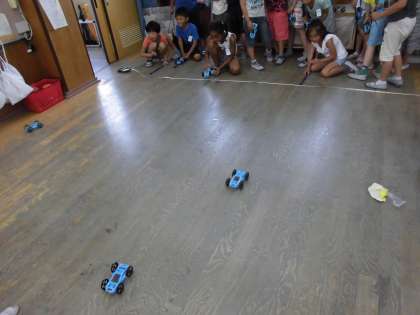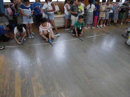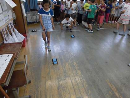 ゴムを引きのばして,戻ろうとする力を使って,車を走らせました。引きのばし方を選んで,走った距離を比べました。