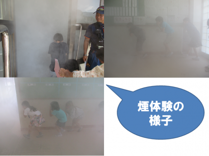 教室に戻る前には煙の中を歩く【煙体験】を全校生徒が行い,腰を低くして壁を伝いながら教室へ戻っていきました。