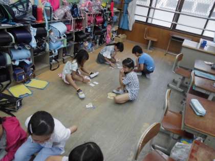 7/4 あいにくの雨で休み時間を教室で過ごしています。トランプをしたり,保護者の方に作っていただいた,記号カルタをしたりして楽しく過ごしました。