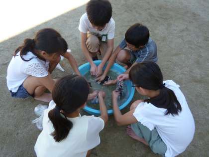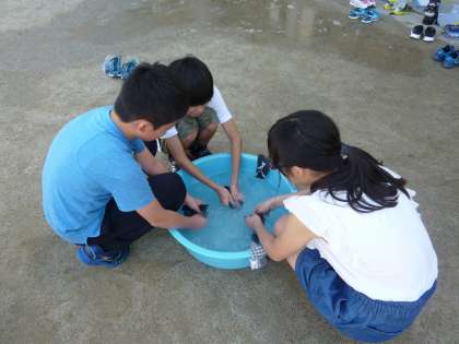 砂場で思い切りよごしたあと,みんなでたらいを囲んで「もみ洗い」「つまみ洗い」をしました。最後は水遊び・・・のような様子でしたがみんな楽しそうに洗っていました。