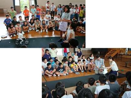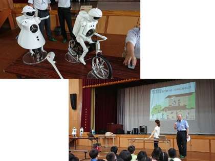 村田機械製作所の方が来てくださり,「ムラタセサク君」と,いとこの「ムラタセイコちゃん」の開発の様子や走行実演を見せていただきました。開発をする中でいろいろな苦労や失敗があったことについてもお話しいただきました。みんな真剣に話を聞き,質問をしていました。