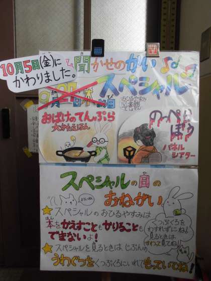 10月5日(金)のお昼休み,読み聞かせの会による『読み聞かせの会スペシャル』が行われました。読んでくださったのは大型絵本『おばけのてんぷら』とパネルシアター『のっぺらぼう』です。