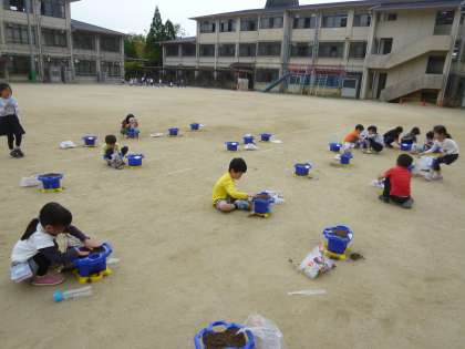 みんなであさがおの種をまきました。植木鉢に土を入れて,肥料をいれてまぜて・・・やることがたくさんあります。お友だちと助け合いながらする姿がみられ嬉しく思いました。どんな花が咲くのでしょうか。楽しみです。しっかりとお水をやって愛情こめて育ててほしいと思います。