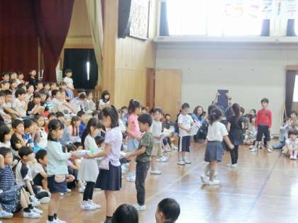 5月10日,1年生を迎える会がありました。5・6年生のお兄さん。お姉さんが中心となってたのしい出し物をしてくださいました。クイズや学校紹介など,劇もまじえながら教えてくれて,1年生は楽しかったようです。2年生からはあさがおの種をもらって,家に持ち帰っています。おうちで大切に育ててほしいです。1年生からは「ありがとう,これからよろしくお願いします。」という気持ちをこめてお礼に「さんぽ」を歌いました。大きな声で上手に歌えていました。すてきなみなみっ子になってくださいね。