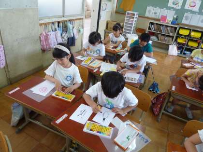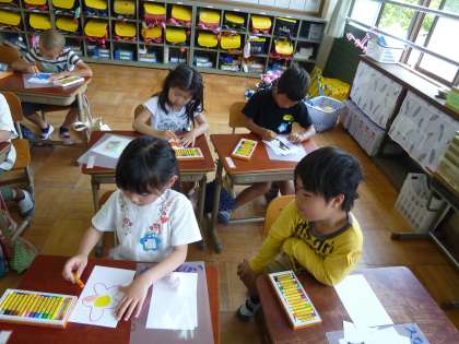 図画工作科では「すきなものなあに?」で,自分がすきなものを描きました。はな,むし,のりもの,おやつ,かたち,どうぶつ,くだものなどそれぞれが好きなものを小さい画用紙に描き表しました。ひとり3つは描けたので,次に画用紙にぺたぺた貼っていきます。