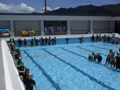 今週から水あそびがはじまりました。まずは低水位で水慣れです。動物になっていろいろな歩き方をしてみたり,水をかけあったり,プールの中を歩いてみたりしました。楽しく安全に学習していきたいと思います。