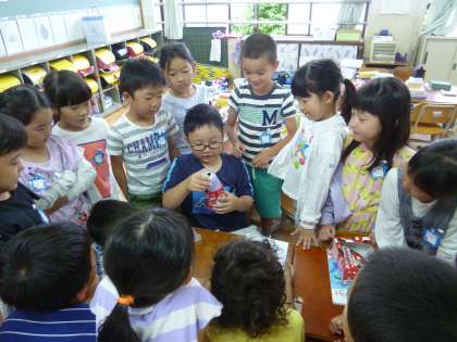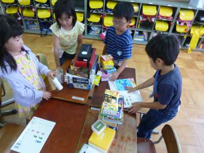 おうちで用意してくださったはこをグループでもちよって仲間に分けました。
