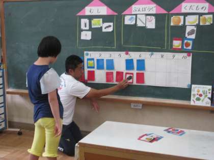 子どもたちは,箱の中から「文房具」「くだもの」「むし」などのものの名まえカードを引いて,そのカードがどの仲間に入るのか考えて,なかまわけをしています。「やりたい人!」の声に,みんな元気いっぱい手を挙げて授業に取り組んでいます。子どもたち同士でヒントを出したりしながら学ぶ姿も見られます。次はどんなものの名まえが出てくるか毎回楽しみにしている6組の子どもたちです。