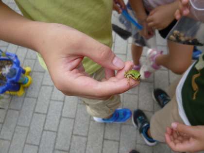 あさがおの種を収穫しました。たった6つぶしか植えていないのに,どの子もたくさん種ができました。2年生からプレゼントしてもらった記憶があるようで,自分たちも来年の新1年生にたねをプレゼントするんだとにこにこしながらお話していました。収穫しているときにかえるを発見!!いきものが大好きな子どもたちです。