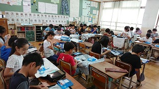家庭科の学習でエプロン製作に取り組んでいます。目の大きさや縫い方を工夫して,丁寧に作業を進めています。