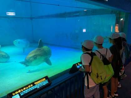 間近で見る海の大きな生き物に,子どもたちは