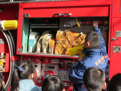 消防士の方に「まず火事がおこったときに現場について何を一番にするのですか?」という質問をしました。すると「まず一番に消火栓の場所を確認して,水源を確保します」という答えをいただきました。そして「消火栓とは」というお話もしていただき,帰り道にみんなで消火栓探しをして帰りました。出張所から学校までの間にたくさんの消火栓がありました。普段何気なく歩いている道ですが,これから少し消火栓の場所なども気を付けて見てほしいと思います。