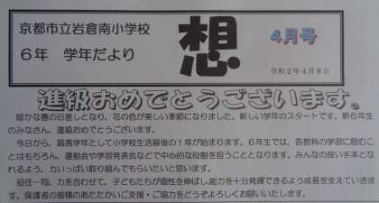 小学校生活最後の一年。今,学校はお休みですが,自分でできることを考えて過ごしてください。みんなに会える日を楽しみにしています。