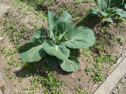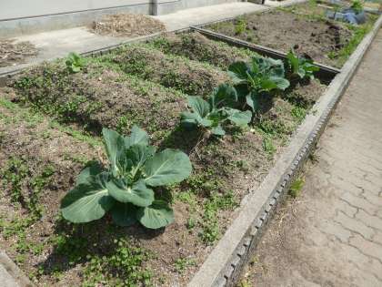 3年生の先生がキャベツを育ててくださっています。何に使うかわかりますか。 答えはモンシロチョウのよう虫のえさ。これから暖かくなると,モンシロチョウが飛んできて,キャベツの葉にたまごを産みます。たまごから生まれたよう虫は,目の前にたくさんあるキャベツの葉を食べて大きくなります。