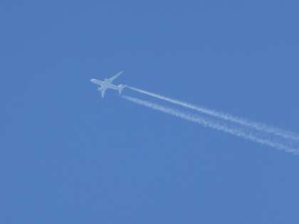 わた雲の写真をとっていたら,頭の上をジェット飛行機が飛んできて,2つ目の写真をとることができました。何という雲か,分かりますか。そう,「飛行機雲」ですね。この雲も,少しだけお天気と関係があるんです。「飛行機雲がなかなか消えないと雨」と言われています。
