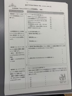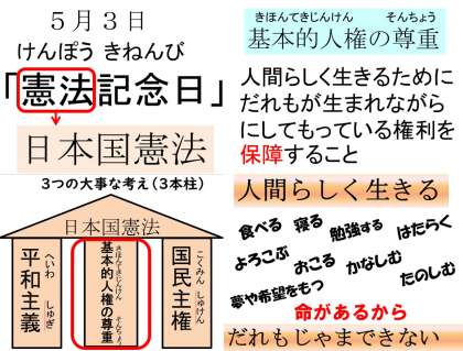 今日と明日で配る課題の中に,社会科「わたしたちのくらしと日本国憲法」のプリントがあります。5月3日は憲法記念日でした。社会科を学ぶ中で,今の暮らしとつなげながら考えられるといいですね。