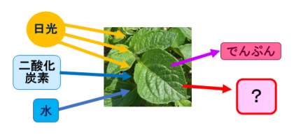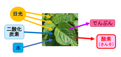 その養分の材料になるものは,植物が根からすい上げた土の中の「水」と,空気中の「二酸化炭素」です。