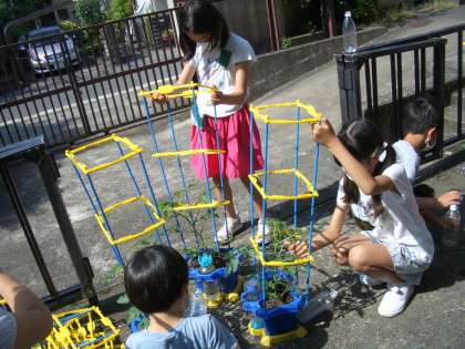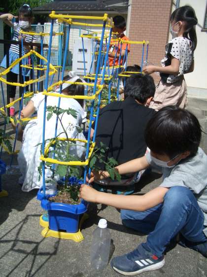 生活科の学習でミニトマトを育てていますが,気温が30度を超える日が続く最近になって,背丈がぐっと伸びてきました。それに合わせて支柱を立てる作業をしているところです。