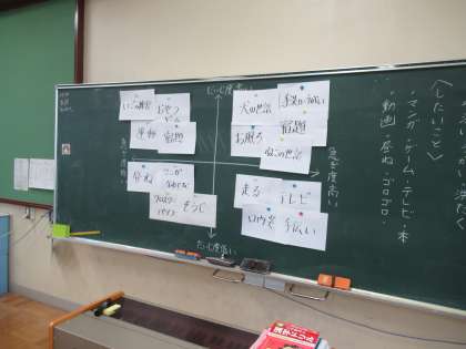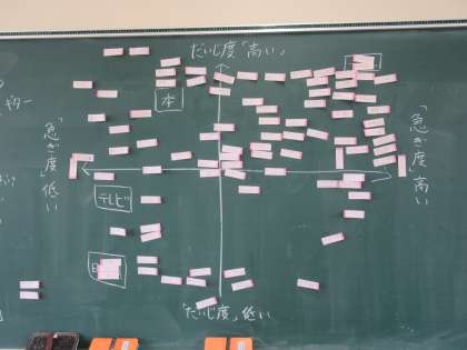 道徳の学習で時間の使い方を話し合いました。子どもたちは「したいこと」「しなければいけないこと」を一つ一つふせんに書き,急ぎ度と大事度の二軸を使って,どこに入るのか考えました。みんなの考えがみえてきておもしろかったですね。