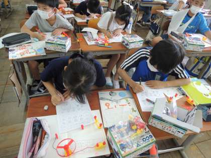 電流の大きさと向きを調べることのできる「かんいけん流計」を使って実験しました。回路をつくるのもスムーズで,実験に対し意欲的な姿はさすが4年生です!かんいけん流計は数に限りがあるので,待っている時間は回路図の記号を練習しました。豆電球クイズは全問正解できたでしょうか?この1時間で電流の大きさはA(アンペア)で表せることを学習し,乾電池の向きを変えると電流の向きも変わることを目で見てしっかりと確認しました。来週も実験がんばりましょう!!