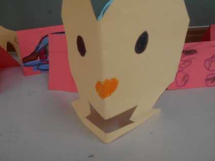 そのままでは立たない画用紙が,2つに折ることによって机の上に立ちます。自分でおった紙が立つと,大喜びをする子どもたちでした。絵を描いたり,端を切って形を工夫したりして,楽しい作品をたくさん作ってくれました。