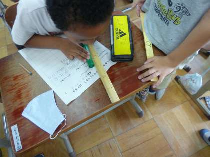 10cmの感覚がだんだん身についてきた子どもたちです。今日は,その感覚をいかして,いろいろなものの長さを予想して測ってみました。調べれば調べるほど,長さの感覚が豊かになっていく子どもたちです。