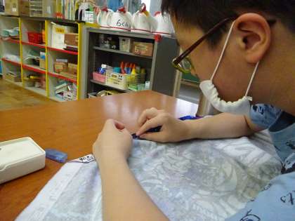 5・6年生は家庭科の学習「針と糸を使って」でエプロンづくりをしています。練習布で波縫いの練習をしてから,エプロン作りに取り掛かりました。