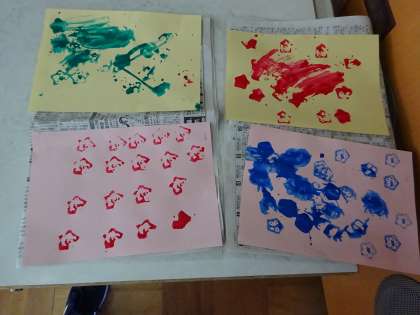 大きなオクラがたくさん収穫できたので,みんなでスタンプ遊びをしました。絵の具のつけかたが難しかったですが,星の形がきれいにスタンプで来た子もいました。