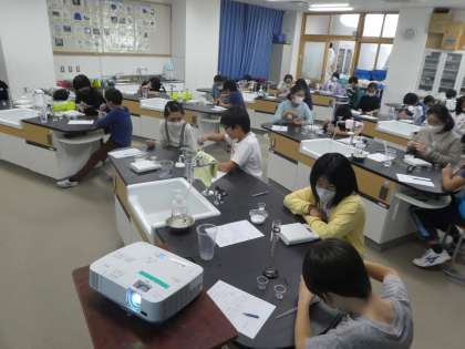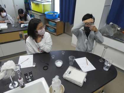 メスシリンダーで正確に50mLの水を計り取ったり,電子天秤で5.0gの食塩を計り取ったりしました。