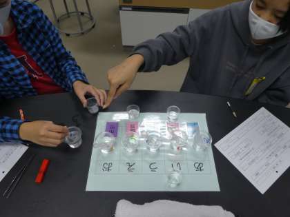 二人で協力しながら,計画書をもとに,よく考えながら実験を進め,5種類の水よう液の正体を調べていました。
