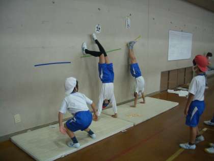 跳び箱の踏切板をマットの下に敷いたり,壁を利用したりして練習しています。
