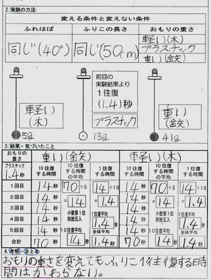 今回は,ふりこのおもりの重さを変えて,1往復の時間を測定しました。