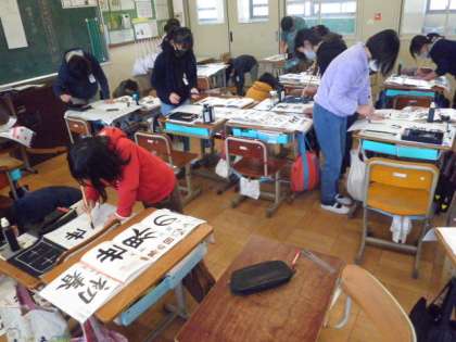 いつもの半紙と違い,長い画仙紙で書いたので,バランスを取るのに苦戦していました。