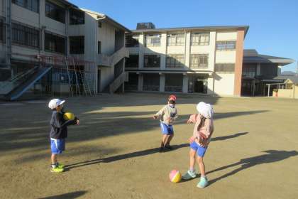 ようぐあそびでは,フラフープやボール遊びなどをグループに分かれて取り組んでいます。