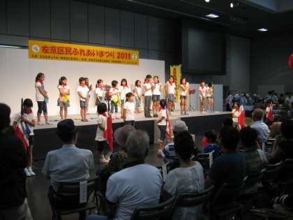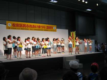 7月24日(日),音楽部の子どもたちが,「みやこめっせ」3階で行われた左京区民ふれあいまつり2011に参加しました。いつもと違う舞台での演奏に子どもたちは緊張していましたが,最後まで立派に演奏することができました。演奏後は,会場から大きな拍手をもらっていました。