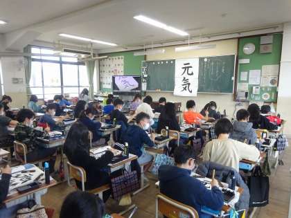 書写の時間にちょっぴりおそい「書初め」の学習をしました。今年初めて書いた字は「元気」でした。4年生にぴったりな2文字でした。今までの書写で学んできた,穂先の動きや「とめ」「はね」「はらい」などを意識して書きました。一画一画をゆっくり丁寧に書いて,今年1年の書写は良いスタートをきれました。