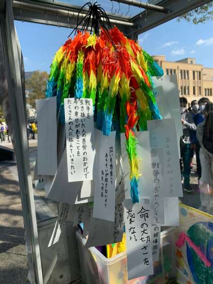 平和の集いでは,願いを書いた折り鶴と祈りの言葉を