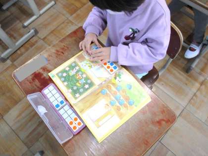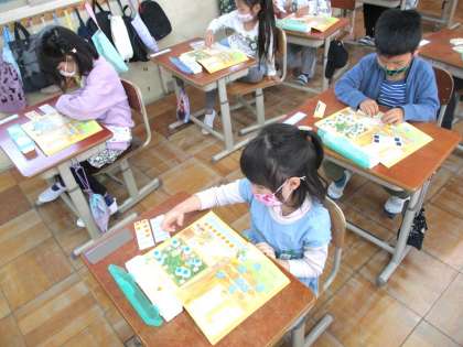 持たせていただいた算数セットの中身を確認したり,数図ブロックを使って数のちがいを見つけたりする活動をしました。