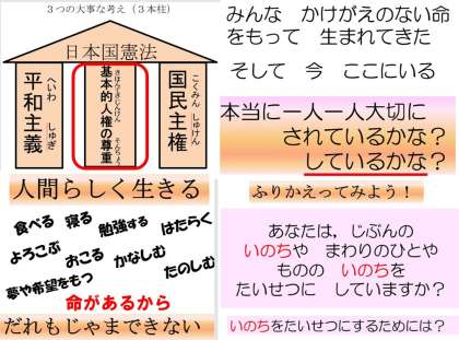 この憲法月間を機会に,ご家庭でも命と人権の大切さについて子どもたちと一緒に話し合う時間をとっていただければと願っています。また,コロナ禍の中で特に問題になっている,「感染者への偏見や差別は絶対に許されない」ことも併せて話題にしていただければと思います。