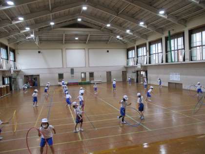 フラフープや棒を使って,さまざまな動きを楽しんでいます。