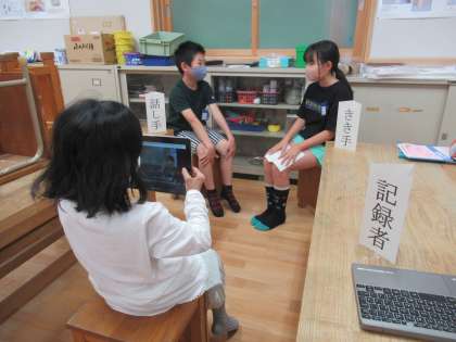 国語科「きいて,きいて,きいてみよう」の学習の様子です。いろいろな『きく』があることを知り,3つの役割に分かれてインタビュー活動を行いました。