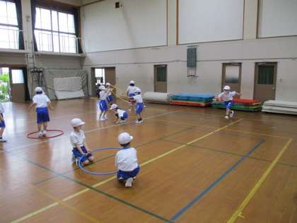 フラフープや棒を使って,グループごとに活動しています。