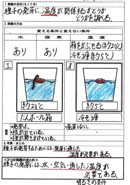 種子の発芽には,水,空気,発芽に適した温度が,必要である。