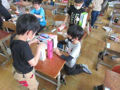 持ってきた箱でいろいろなものを作りました。1組では「京都タワー」が大人気。たくさんの京都タワーができました。