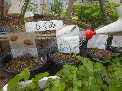 乾燥したオクラから種を取り,硬さや大きさ,色などをみんなで調べて種まきをしました。日に日に成長しています。トウモロコシやミニトマト,キュウリの種も蒔き,自分が育てたい野菜を一鉢用意しお世話をしています。夏休みにおうちに持ち帰りたいと,毎日水やりをしながら大切に育てています。