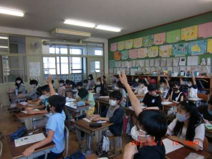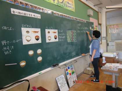 栄養教諭の藤井先生と「食べ物の選び方」について考えました。栄養バランスのとれたメニューや量について考えました。