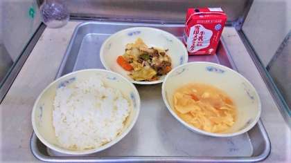今日の給食は子どもたちに人気がある焼肉とトマトと卵のスープです。