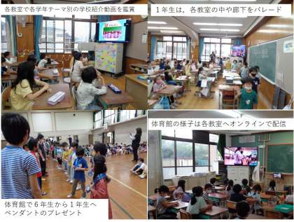 まずは,各学年が事前に準備した,テーマ別の学校紹介動画の鑑賞です。そして,6年生の計画委員が1年生を連れて,各教室の前の廊下(一部は教室の中)をパレードしました。ゴールは体育館。6年生が待っていて,ペンダントのプレゼントです。