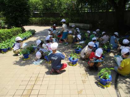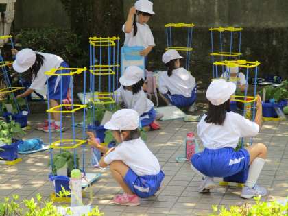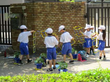 生活科の学習で育てているアサガオのつるが伸び始めました。