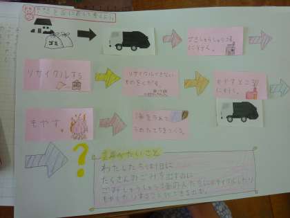 子どもたちは「ごみはリサイクルできるものとできないものを分けて,燃やせないものはリサイクルすると思う。」「ごみは全て燃やされてなくなると思う。」など,いろいろに予想していました。これからの調べ学習でどんなことが分かるのか,子どもたちは楽しみにしている様子でした。